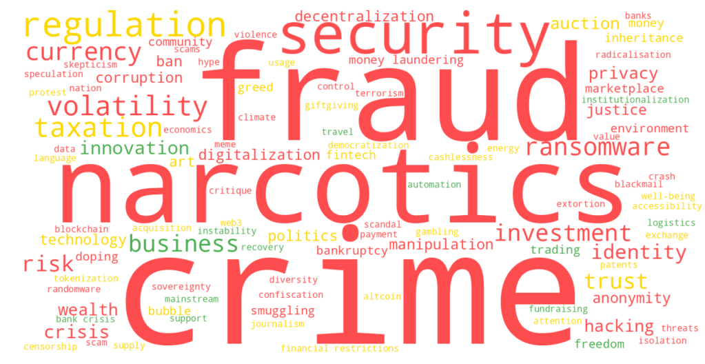 The most common themes included crime, drugs, fraud, security, volatility, currency, investment, and ransomware.