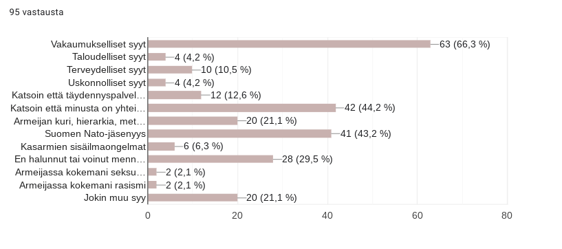 Piilossa olevat teksti: Katsoin että täydennyspalveluksesta on minulle enemmän hyötyä; Katsoin että minusta on yhteiskunnalle enemmän hyötyä täydennyspalveluksessa; Armeijan kuri, hierarkia, metsäharjoitukset tjms tuntui epämiellyttävältä; En halunnut tai voinut mennä kertausharjoituksiin; Armeijassa kokemani seksuaalinen häirintä ja seksistinen kulttuuri.