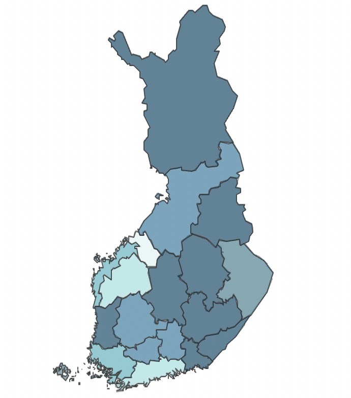figure 10. suicides per 100 000 inhabitants per region, 2016–2020. Darker blue means to more suicides compared to lighter blue (THL, 2021c)