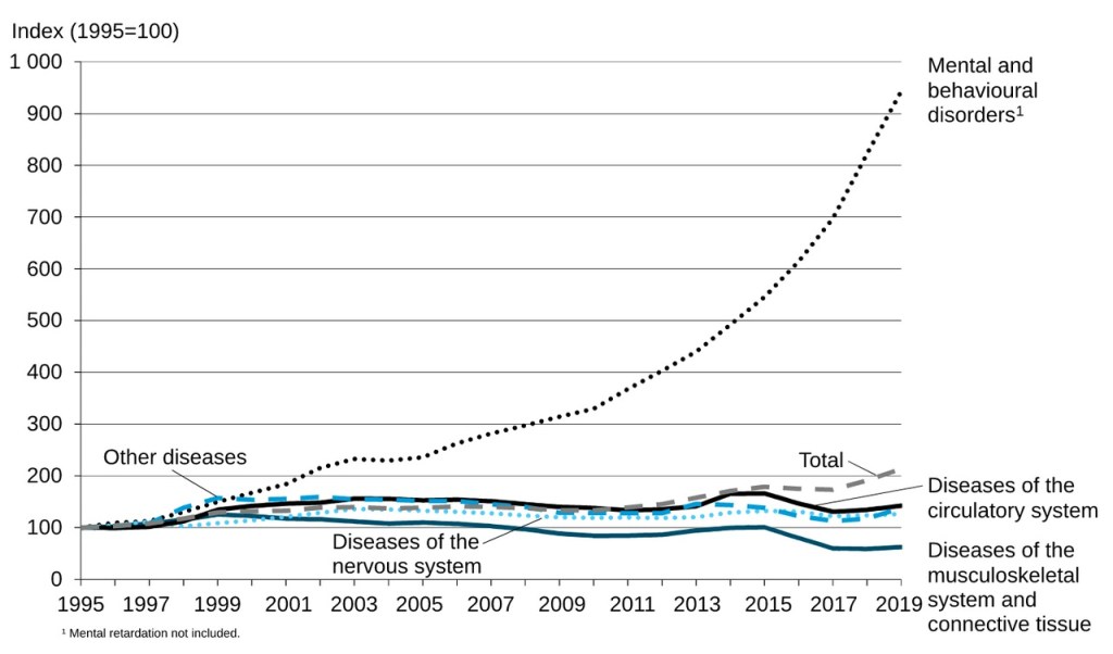 Laukkala et al. (2002) and Vilhelmsson (2013) report that there was a fourfold surge in the use of antidepressants after 1990. The available data suggests that reimbursements for depression medicines between 1994 to 2020 tripled (figure 4), which is associated with an exponential amount of behavioral and mental illness diagnoses between 1995 and 2019 (figure 5). People finally received the help they needed.