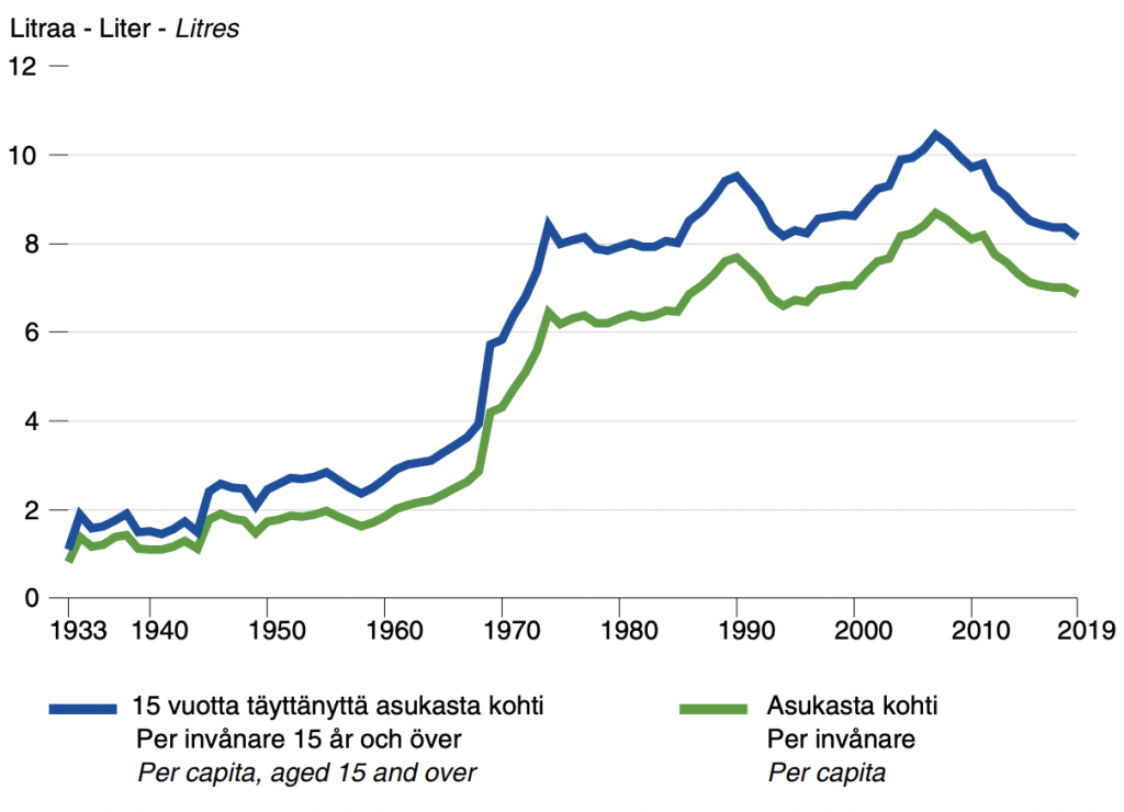 figure 8. recorded consumption of alcoholic beverages, 100% alcohol, 1933–2019 (THL, 2020)
