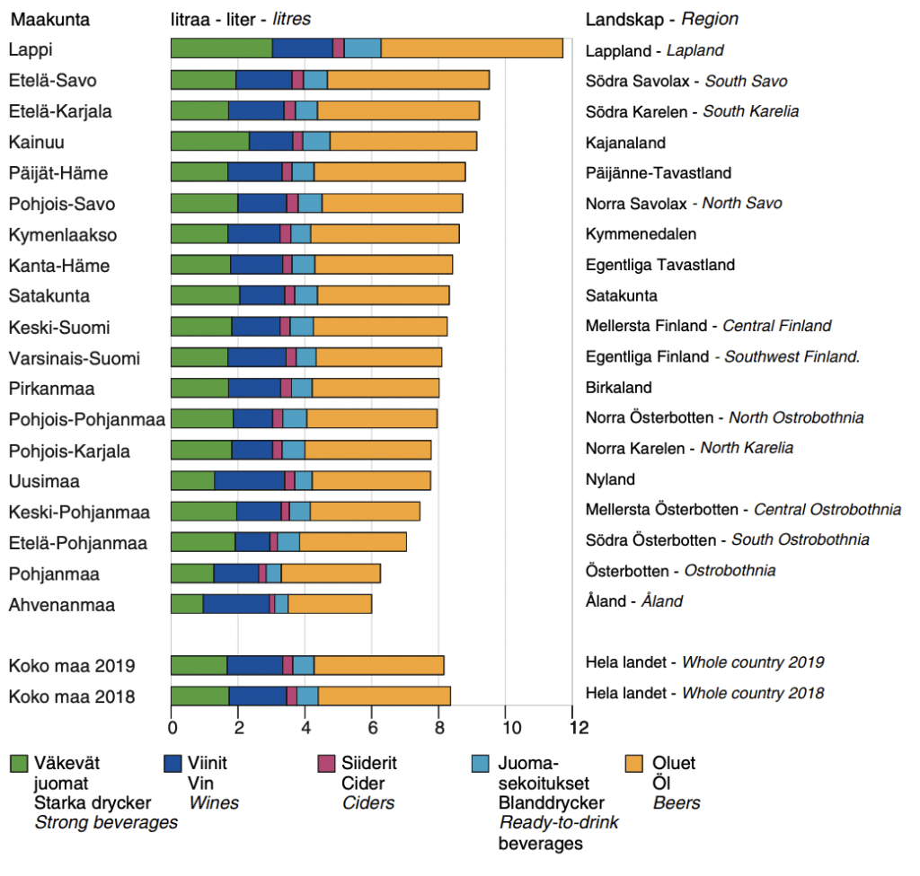 figure 9. sale of alcoholic beverages by type of beverage and by region, per capita aged 15 and over, 100% alcohol, 2019 (THL, 2020)