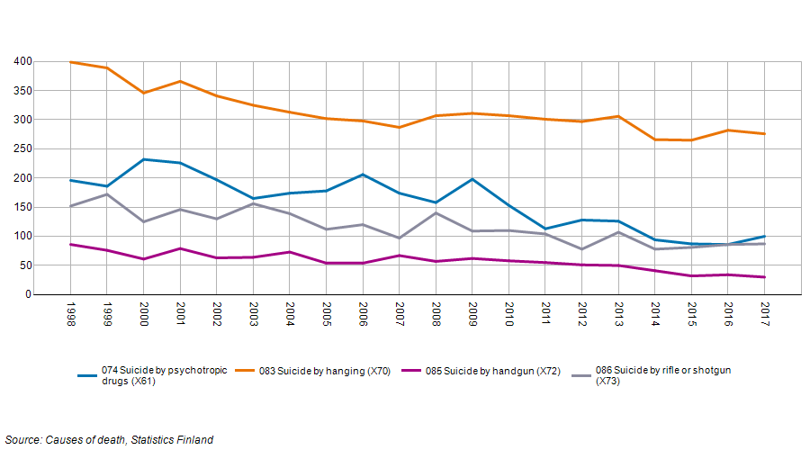 Limiting lethal means of suicide like firearms may reduce suicides (Abrams et al., 2020). It is easier to commit suicide if there are means to do it. In Finland, firearms (i.e., handguns, rifles, and shotguns) have over the years been the third most commonly used method in suicide (figure 6).