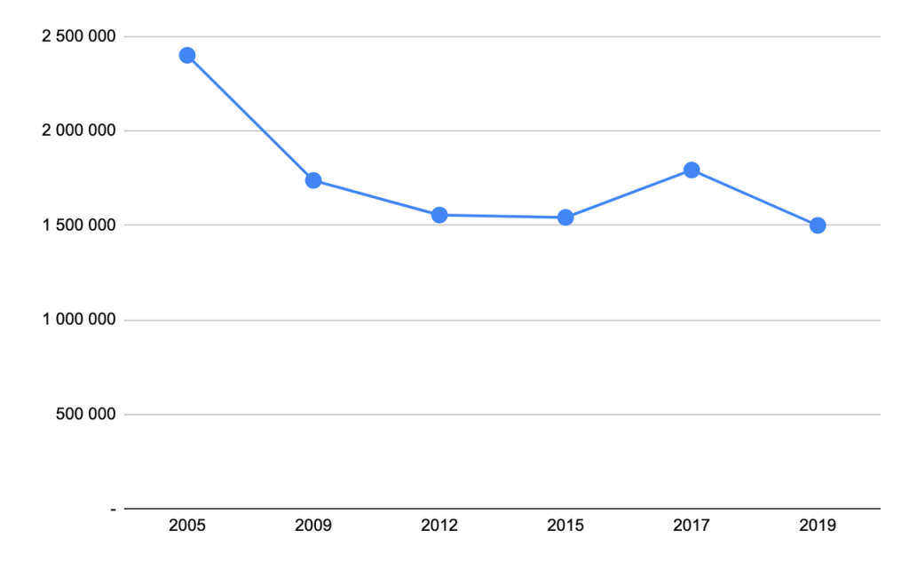 figure 7. number of privately owned licit and illicit firearms, 2005–2019 (Alpers, Michael, & Dylan, 2021; MOI, 2021)